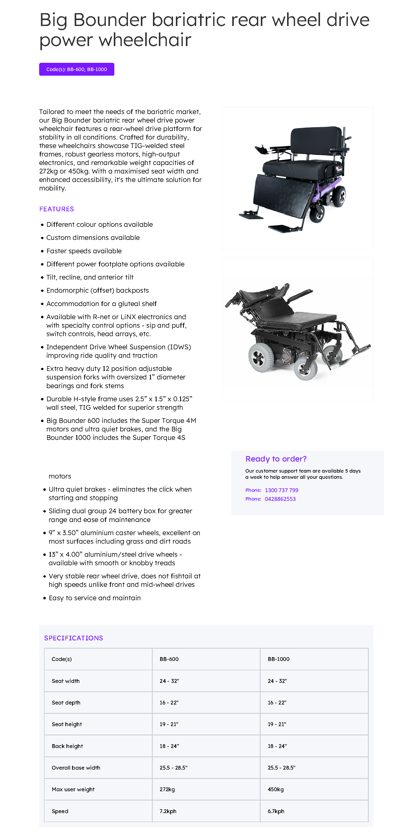 The Big Bounder Bariatric Rear Wheel Drive Power Wheelchair offers full scriptability to meet the most complex bariatric mobility requirements. Available in 272 kg (BB-600) and 450 kg (BB-1000) safe working loads, it combines a stable rear-wheel drive platform with precision engineering for superior performance in all conditions. Clinicians can customise every detail — seat dimensions, postural supports, control systems (R-net or LiNX), suspension, and power positioning — to achieve an optimal fit and function for each client. With a TIG-welded steel frame, heavy-duty adjustable suspension forks, and quiet, high-torque motors, the Big Bounder is designed for durability, stability, and comfort in both home and community settings.