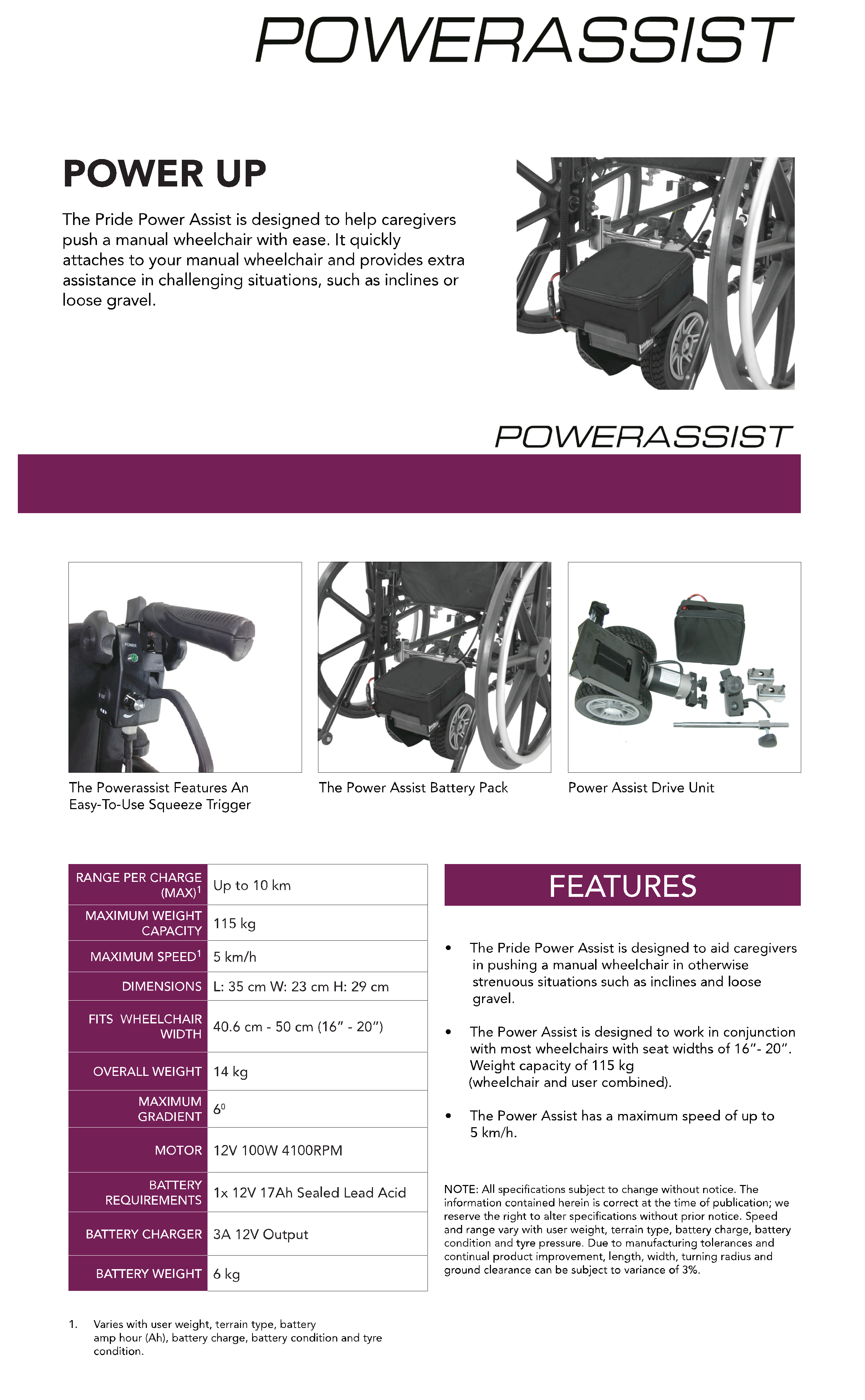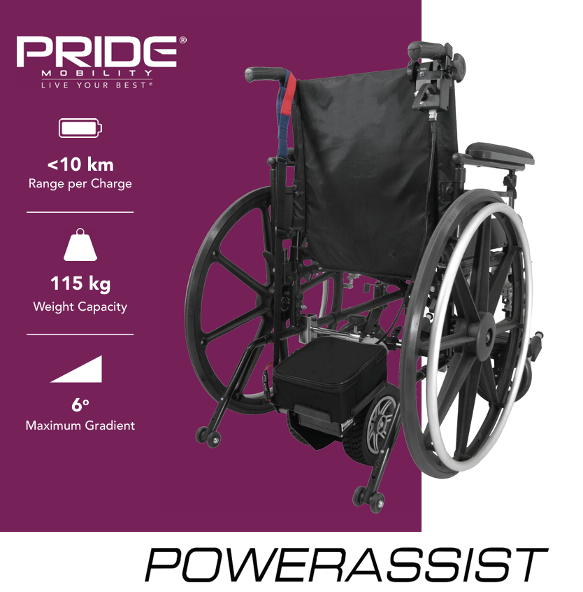Enhance your caregiving experience with the Pride Power Assist. This innovative device quickly attaches to most manual wheelchairs (16”–20” seat width) and helps caregivers push with ease — even on inclines or rough terrain like loose gravel. With a 115 kg weight capacity (chair + user) and a top speed of 5 km/h, the Pride Power Assist makes wheelchair transport smoother, safer, and less strenuous.