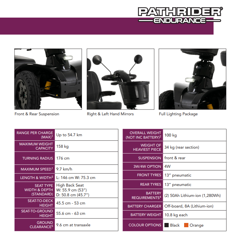 Unleash your spirit of exploration with the Pathrider® Endurance, the ultimate long-range all-terrain mobility scooter engineered for performance, comfort, and independence. Designed for thrill-seekers and outdoor enthusiasts, this powerhouse features dual 50Ah lithium-ion batteries that deliver an exceptional single-charge range of up to 54.7 km—making it one of the most capable scooters in its class.